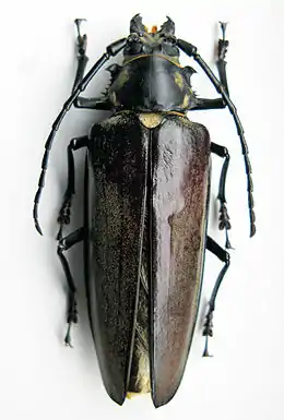 Довжина тіла самців 85-108 мм, самок — 65-85 мм. Фарбування тіла коричневе, чорно-коричневе. Надкрила каштанового кольору. На передньоспинці — шість більших втиснень, покритих жовтуватими волосками Напроти щитка, дві невеликих цятки покритих жовтуватими волосками. Ока глибоко виїмчасті. Щелепи самця великі, помітно довщі за голову, у базальній половині з великим зубцем. По бічних краях передньоспинки — багато загострених шипів. Передні кути передньоспинки сильно витягнуті. Вусики у самця довщі, ніж у самки, не досягають вершини надкрил. Третій членик вусиків подовжений.