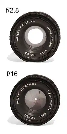 У фотографії розмір вхідної зіниці (а не розмір самої фізичної апертури) використовується для калібрування відкриття та закриття діафрагмової апертури. F-число ("відносна апертура"), N, визначається як N = f/E N, де f — фокусна відстань, а E N — діаметр вхідної зіниці. [6] Збільшення фокусної відстані лінзи (тобто збільшення), як правило, призводить до збільшення f-числа, а розташування вхідних зіниць рухається далі по оптичній осі.