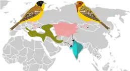 ![]() Мапа поширення чорноголової (оливковим кольором) та рудоголової (рожевим кольором) вівсянок | ||||||||||||||||