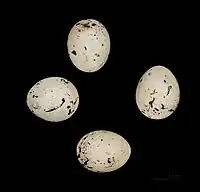 У повній кладці 4-6 (найчастіше 5) яєць. Шкаралупа матова, біла, з легким сірим, блакитнуватим, рожевим або навіть світло-коричневим відтінком. По ній доволі рідко розкидані плями, крапки, звивисті лінії: порівняно великі поверхневі (чорні, чорно-бурі або вишнево-чорні) та більш дрібні глибокі (світо- і фіолетово-сірі або рожево-фіолетові). Середні розміри яєць: 19,61×15,46 мм. До відкладання яєць птах приступає на початку травня — початку червня. Протягом року, ймовірно, одна кладка. У випадку загибелі кладки буває повторна. Насиджує протягом 11-12 діб самка.[7]