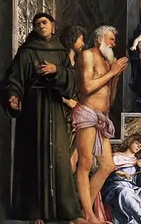 Богородицю подано на троні, котрий оточують святі. Серед них праворуч св. Домінік, Луї Тулузький і святий Себастьян. Ліворуч розташовані Іван Хреститель, святий Йов Багатостраждальний та Францис Ассізький. Частка святих заглиблена у власні думки чи власні пошуки істини (святий Себастьян, святий Домінік, Франциск Ассізький взагалі повернутий до глядачів). Вважають, що фігура Франциска Ассізього була скопійована або ретельно вивчалась при створенні вівтаря роботи Джорджоне, відомого як Мадонна Кастельфранко.