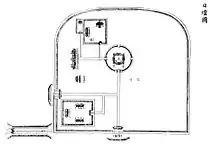 Вівтар оточено низькою стінкою круглої форми (коло — символ Неба). З кожного боку світу всередину ведуть церемоніальні ворота. Західні брами — потрійні, з 6 стовпами-опорами. Решта брам — одинарні, з двома колонами. Стулки брам і стіни пофарбовані в червоний колір. Черепиця — зеленого забарвлення.