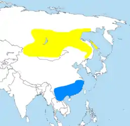 Гніздовий ареал виду знаходиться на північному сході Азії. Поширений на півдні Сибіру, Алтайських горах, Далекому Сході Росії, на Сахаліні, в Монголії, на північному сході Китаю і, можливо, в Північній Кореї. Гніздиться в хвойних або змішаних лісах. На зимівлю мігрує на підень Китаю та північні частини В'єтнаму, Лаосу і Таїланду.