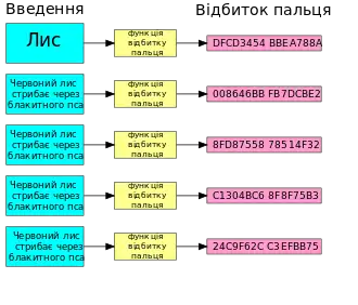 Функції відбитків пальців можна розглядати як високопродуктивні геш-функції, використовувані для однозначної ідентифікації значних блоків даних, той самий випадок, коли криптографічні хеш-функції можуть виявитися непотрібними. Не слід плутати аудіо алгоритми відбитків пальців, з цим типом функції відбитків пальців.