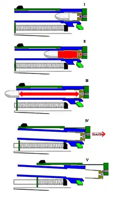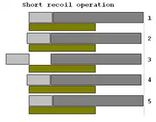 - Короткий хід ствола — хід ствола менше ходу затвора. Перед пострілом затвор і ствол жорстко зчеплені, і в момент пострілу під дією віддачі починають відкат як одне ціле. Пройшовши відносно невелику відстань, затвор і ствол роз'єднуються, затвор продовжує відкат, а ствол або залишається на місці, або повертається у вихідне положення за допомогою власної поворотної пружини. За час від початку відкату до розчеплення куля встигає вийти за межі ствола. Зброя на цьому принципі може мати досить просту будову і бути компактною і легкою, тому схема з коротким ходом ствола набула широкого поширення в пістолетах. ГОСТ 28653—90 визначає короткий хід ствола, як відкат ствола стрілецької зброї на відстань, меншу довжини патрона.