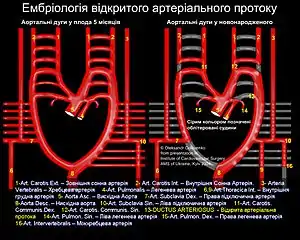 ![]() Відкрита артеріальна протока між аортою та легеневою артерією Відкрита артеріальна протока між аортою та легеневою артерією | |