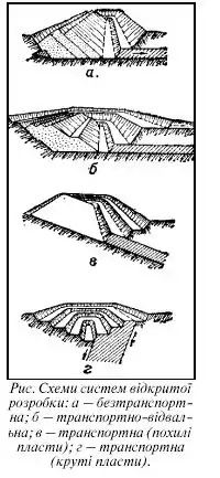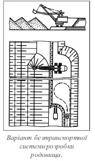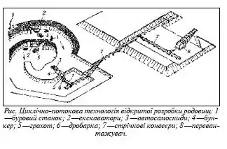 Сукупність технологічних і технічних засобів, які забезпечують ефективне проведення процесу розробки родовища кар'єром, встановлений для даних геологічних умов та прийнятих засобів механізації порядок ведення підготовчих, нарізних та очисних робіт у просторі і часі. Класифікація способів розкриття і систем розробки родовищ за ознакою розвитку і механізації гірничотранспортних робіт як єдиної гірничотранспортної системи подана в табл. Кар'єр розглядається як складна сукупність ведення виймальних робіт і транспортування гірських порід на поверхню. Динаміка їх переміщення у просторі кар'єрного поля обумовлена гірничотранспортною системою, під якою розуміється установлений порядок виконання підготовчих, розкривних і видобувних робіт до кінцевої глибини з поетапним уведенням різних видів транспорту, що забезпечують безпечне економічне та найбільш повне виймання корисних копалин. Різноманітність гірничогеологічних умов, в яких будуються й експлуатуються кар'єри, широкий вибір гірничотранспортного обладнання та сфери його використання обумовлюють виділення трьох груп гірничотранспортних систем, підгруп і рівнів класифікації. Вивчення питань розробки покладів показує, що формування робочої зони на повну глибину кар'єру з переміщенням її уздовж пласта корисної копалини і утворенням виробленого простору по кінцевому положенню кар'єрного поля відповідає групі суцільних систем при розробці в основному пологих родовищ. У той же час є позитивний досвід відробки похилих і крутих покладів з переміщенням порід розкриву у вироблений простір безтранспортним способом або із застосуванням конвеєрів, автосамоскидів та залізничних потягів.