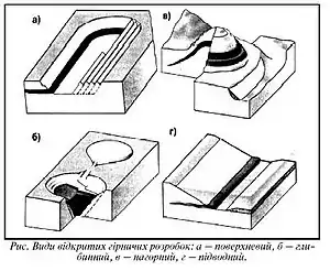 Відкрите розроблення родовищ полягає у підготуванні поверхні землі (в основному у видаленні родючого шару, виведенні поверхневих вод), осушенні (в разі потреби) родовища, його розкритті (спорудженні траншей), виконанні розкривних робіт (у тому числі відвальних робіт) і робіт видобувних — відокремленні корисних копалин від масиву. Здійснюється за допомогою відкритих гірничих виробок (див. кар'єр). Осн. гірничі виробки В.р.р.к.к. — капітальні траншеї, що забезпечують доступ до корисних копалин і розрізні траншеї, що підготовлюють кар'єрне поле до розкривних і добувних робіт. В.р.рк.к. широко застосовується в Україні, США, Австралії, Росії, Канаді, КНР, в ряді країн Європи (ФРН, Польща, Чехія).