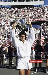 Габріела Сабатіні піднімає трофей над головою після перемоги у фіналі над Штеффі Граф