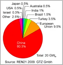 Близько 50 МВт встановленої сонячної потужності додано в Китаї 2008 року, що більш як удвічі перевищує показник 2007 року 20 МВт[22]. Уряд оголосив про намір збільшити встановлену потужність до 20 ГВт до 2020 року[23]. Якщо китайським компаніям вдасться розробити дешеві й надійні сонячні модулі, то це стане виходом для країни, яка відчайдушно намагається знизити свою залежність від вугілля та імпорту нафти, а також тиск на своє довкілля, перейшовши на відновлювані джерела енергії[24].