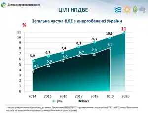 У жовтні 2014 року Кабінет Міністрів України затвердив Національний план дій з відновлюваної енергетики до 2020 року, який передбачає збільшення частки відновлюваних джерел у загальному балансі генерації електроенергії з близько 1% до 11%.[17]