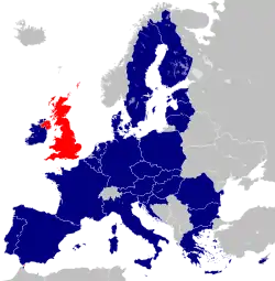 Після відокремлення Великої Британії від ЄС 31 січня 2020 р., [lower-alpha 1] Велика Британія продовжувала відповідати нормам ЄС та брати участь у Митному союзі ЄС під час " перехідного періоду Brexit ", який закінчився 31 грудня 2020 р.