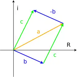 Де: , — уявна одиниця. Якщо представити комплексні числа векторами на комплексній площині, то операція віднімання матиме таку геометричну інтерпретацію: різницею комплексних чисел та , заданих у вигляді векторів на комплексній площині є вектор, що сполучає кінці зменшуваного і від'ємника і направлений від від'ємника в сторону зменшуваного.