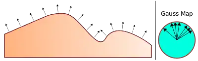 - У локальних координатах позначаючи відображення Гауса можна задати як Звідси очевидною є диференційовність відображення. Даний запис можна подати для довільної регулярної поверхні тому для кожної такої поверхні відображення Гауса існує локально. Але глобально його можна ввести лише для орієнтовних поверхонь.