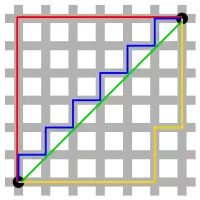 - Довжина найкоротшого можливого шляху в просторі між двома точками, при умовах що між ними нема перешкод (формально називається Евклідовою відстанню)