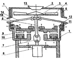 Відцентровий дезінтегратор на магнітній подушці: 1 — корпус, 2 — кришки, 3 — ротор, 4 — розгінні ребра, 5 — вал ротора, 6 — відбійні плити, 7 — муфта, 8 — двигун, 9—10 — постійні магніти і електромагніти магнітної подушки вертикального підйому, 11—12 — магніти, що створюють магнітну подушку горизонтальної стабілізації, 13 — завантаження, 14 — кожух, 15 — розвантаження