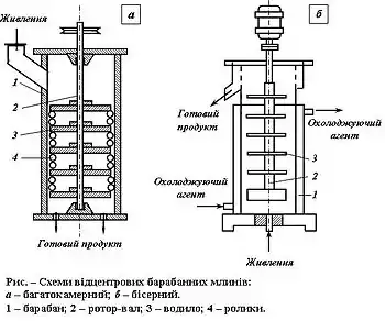 Багатокамерний відцентровий млин (рис. а) складається з нерухомого вертикального барабана 1 з ротором-валом 2, що обертається в середині його. На водилах 3 ротора-вала 2 шарнірно закріплені ролики 4 або вільно розміщені кулі.