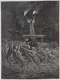 Відьомський шабаш: відьми танцюють навколо диявола. Гравюра Еміля Байяра, 1870 р.