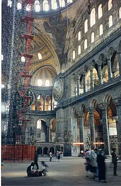 До цього підкупольного простору прилягають зі сходу і заходу дві величезні ніші з напівсферичним верхом: у східну нішу відкриваються своїми арками ще три менші ніші, з яких середня, яка слугує вівтарною апсидою, глибше за інші і видається з загального плану храму у вигляді півкруга; до західної великої ніші прилягають також три ніші; з них середня, являє собою не напівсферичний звід вгорі, а звичайний коробовий звід, має в собі три двері, які ведуть до прибудованих до храму внутрішніх і зовнішніх притворів (esonartex та exonartex), попереду яких колись знаходився тепер не існуюче подвір'я, обнесений галереєю з колонами; під цими арками йде ще по ярусу подібних арок, якими відкриваються до підкупольного простору влаштовані в бокових кораблях галереї гінекея, а ще вище — величезні арки, які підтримують купол, закладені прямою стіною з вікнами, які розташовані у три ряди. Окрім цих вікон, внутрішній простір храму дають рясне, хоча і дещо розсіяне освітлення 40 вікон, які оперізують підставу купола, і по п'ять вікон у великих і малих нішах.