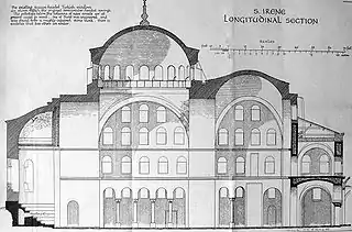 Церква Святої Ірини своїм планом і внутрішністю сильно нагадує Святу Софію в малому вигляді; проте купол її не плоский, а являє собою поглиблення у 1 1/3 свого радіусу; вона цікава тим, що в ній, окрім головного купола, є також інший, який знаходиться над трапезною частиною і має рідкісну в візантійському мистецтві форму еліпса.
