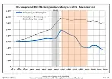 Динаміка населення з 1875 року в сучасних кордонах (Синя лінія: населення; Пунктир: відносна порівняльна динаміка населення землі Бранденбург; Сірий фон: період Третього рейху; Помаранчевий фон: період НДР)