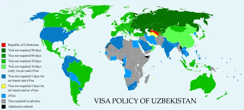 Власники підтвердження візи (штампа), видана Міністерством закордонних справ Узбекистану, можуть отримати візи по прильоту в Ташкентський Міжнародний аеропорт. Узбекистан планує ввести систему електронних віз з 1 липня 2018. В Узбекистані планується ввести 72-годинний безвізовий транзит з 1 травня 2018 року. Список країн буде затверджено постановою Уряду.
