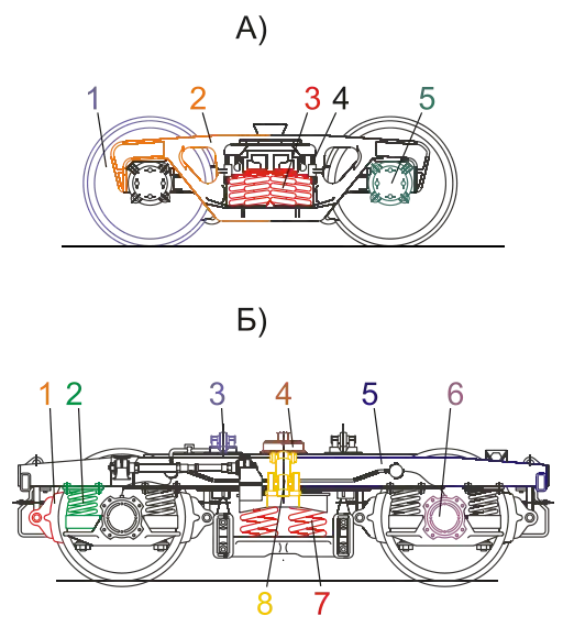 б) — типу КВЗ-ЦНИИ пасажирського вагона: 1 — гальмівна колодка; 2 — буксове ресорне підвішуванння; 3 — ковзун; 4 — підп'ятник; 5 — рама; 6 — букса; 7 — центральне ресорне підвішування; 8 — гасник коливань.