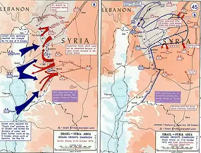 Ірак також послав на Голани свої експедиційні сили у складі 30,000 солдатів, 500 танків і 700 бронетранспортерів. Іракські дивізії виявилися неприємним стратегічним сюрпризом для ізраїльтян, які очікували, що будуть сповіщені розвідкою про подібні переміщеннях з точністю до доби. Іракські війська атакували виступ на південному фланзі ізраїльтян, змусивши останніх відступити на кілька кілометрів, щоб уникнути оточення. Контратаки сирійських, іракських і йорданських військ зупинили просування ізраїльської армії, але не змогли вибити ізраїльтян із захопленого району Башан.
