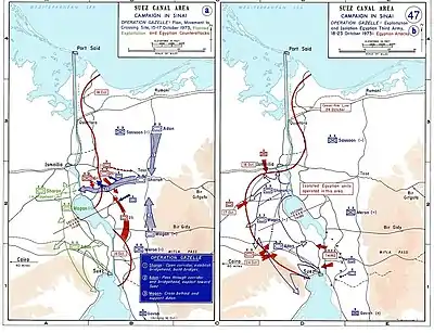 ![]() Єгипетські війська форсують Суецький канал 7 жовтня Єгипетські війська форсують Суецький канал 7 жовтня | |||||||||