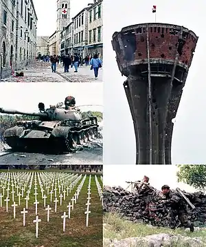 ![]() За годинниковою стрілкою від верхнього лівого кутка: центральна вулиця Дубровника Страдун у руїнах під час облоги Дубровника; пошкоджена Вуковарська водонапірна башта — символ початку конфлікту, увінчана хорватським триколором; бійці хорватської армії готуються підбити сербський танк; Вуковарське меморіальне кладовище; сербський танк Т-55, підбитий на шляху до Дрніша. Внизу: Вуковар у руїнах, 1991 р. | |||||||||||
