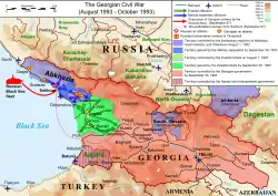 Війна в Абхазії — збройний конфлікт на території Грузії, що відбувався у 1992—1993 роках. Причиною конфлікту стали дії проросійської частини абхазької політичної еліти, спрямовані на від'єднання від Грузії і приєднання до Росії. Наміри проросійських сепаратистів відірвати райони абхазької автономії від Грузії намагалась блокувати грузинська держава. З абхазького боку, крім російських агентів і місцевих незаконних військових формувань, воювали також «добровольці» з Північного Кавказу (передусім пов'язані з Росією чеченці, інгуші та кабардинці). Організація Human Rights Watch відзначила велику кількість етнічних росіян, які перед тим не проживали в Грузії чи Абхазії, але були помічені в боях на абхізькій стороні. Human Rights Watch має свідчення, що як мінімум велика частина з них були професійними військовими, найнятими і оплаченими певними урядовими підрозділами з Москви[1]. Нібито декларуючи нейтралітет, Росія насправді допомагала абхазькій стороні військовою технікою і військами, та в певні моменти відкрито застосовувала свої військові сили, як наприклад в облозі Сухумі 1993 року). Війна завершилася окупацією російськими військами частини території Грузії, яка фактично стала повністю контрольована Росією.