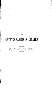 Обурений такою ситуацією, Керкгоффс публікує «Військову криптографію» в «Журналі військових наук»(фр. Journal des sciences militaires) у випусках за січень і лютий 1883 року. Стаття швидко отримала визнання, і в тому ж році була перевидана у вигляді окремої брошури.