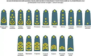 | Українське звання | Молодший лейтенант | Лейтенант | Старший лейтенант | Капітан | Майор | Підполковник | Полковник | Генерал-майор | Генерал-лейтенант | Генерал-полковник | Генерал армії України |