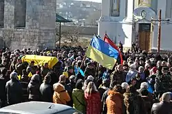 Поховальна група знімає з труни Державний Прапор України та розгортає його над нею.