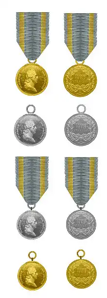 Медаль ордена — кругла, золота. На лицьовій стороні зображений бюст Фрідріха Августа. По колу йде напис: «FRIDERICH AUGUST KOENIG VON SACHSEN» («ФРИДРИХ АВГУСТ КОРОЛЬ САКСОНІЇ»). На зворотному боці медалі — герб Саксонії, обрамлений девізом ордену.