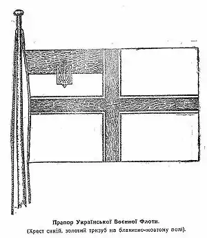 Цікава історія появи на першому українському військово-морському прапорі тризуба з хрестом. Коли на засіданні Секретаріату затверджувався закон про флот, то соціал-демократи були проти того, щоб на середньому зубі тризуба був хрест. Однак старший лейтенант Білинський Михайло Іванович заявив, що «моряки в море без хреста не вийдуть». Також він заявив, що цей хрест буде пам'ятним знаком для українців, що загинули під час війни, і одночасно буде служити нагадуванням про старі козацькі морські прапори. Проти цього аргументу опоненти Білинського нічого сказати не змогли. Так на полотнищі першого українського військово-морського стяга з'явився золотий хрест в наверші знака Святого Володимира Великого, як пам'ять про подвиг екіпажу мінного загородника «Прут», що загинув 29 жовтня 1914 року, команда якого була укомплектована практично повністю з одних українців[8].