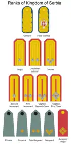 | Назва сербською | Пуковник Pukovnik | Потпуковник Potpukovnik | Мајор Major | Капетан I класе Kapetan I klase | Капетан II класе Kapetan II klase | Поручник Poručnik | Потпоручник Potporučnik |