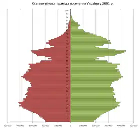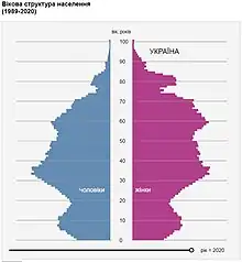 Для сучасної[коли?] демографічної ситуації характерне поступове старіння населення України. Внаслідок постійного зниження народжуваності впродовж останнього століття, частка дітей знизилась з приблизно 40% на початку XX ст. до 15% на початку XXI ст. Частка працездатного населення змінювалася повільно і коливалась у межах 60% — 62%. Натомість, зі збільшенням тривалості життя і зниженням смертності, спостерігалося зростання частки населення старше 60 років — від 3-4% на початку XX ст. до 21% на початку XXI ст.