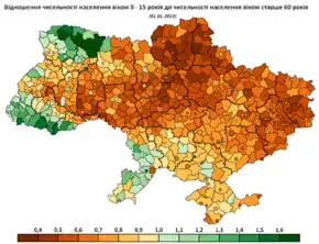 | Населення віком 0 - 14 років | Населення віком старше 65 років | Відношення кількості населення 0 - 14 років до кількості населення старше 65 років | Відношення кількості населення 0 - 14 років до кількості населення старше 60 років |