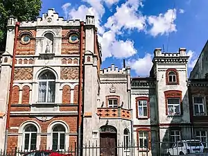 «Споруда різноповерхова, цегляна, тинькована, у плані складної конфігурації. Наріжні об'єми триповерхові, оформлені у вигляді веж ґотичного замку. Поверхи поділені тягами, аркатурними пасками, вікна арочної та прямокутної форм, у широких обрамленнях. Фасад від вул. Козака (нині — вул. Каліча Гора) акцентує арка під псевдоґотичним причілком з поміщеною у нішу статуєю Діви Марії.