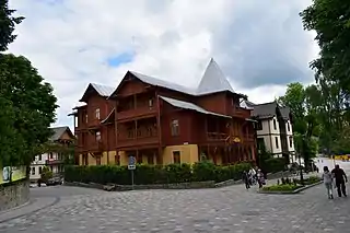 Будівля вілли дерев'яна, триповерхова, завершується пірамідальним дахом.