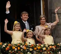 30 квітня 2013 року принц Оранський вступив на престол і став королем; він обрав подвійне тронне ім'я (хоча існувало припущення, що він буде титулуватися Віллемом IV). Віллем-Олександр став першим чоловіком на нідерландському престолі за 123 роки. Його дружина, принцеса Оранська Максима, стала королевою Нідерландів, а їхня старша донька, принцеса Катаріна-Амалія — спадкоємицею престолу і принцесою Оранською.