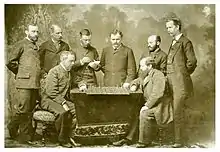 1. e4 e5 2. Кf3 Кc6 3. Сc4 Сc5 4. c3 Кf6 5. d4 ed 6. cd Сb4 7. Кc3 d5 8. ed К:d5 9. O-O Сe6 10. Сg5 Сe7 11. С:d5 Білі проводять масовий розмін, щоб не дати чорним рокірувати. 11…С:d5 12. К:d5 Ф:d5 13. С:e7 К:e7 14. Тe1 f6 Чорні збираються здійснити штучне рокірування і водночас захищають поля e5 і g5 від коня. 15. Фe2 Фd7 16. Тac1 c6 17. d5! Жертвою пішака білі відкривають лінію і звільняють поле для коня. 17…cd 18. Кd4 Крf7 19. Кe6 Тhc8 20. Фg4 g6 21. Кg5+ Крe8 (див. діаграму) Тут Стейніц проводить далеко розраховану комбінацію, яка в різних варіантах завершується матом або вирішальною матеріальною перевагою білих. 22. Т:e7+!! Крf8 Виникає рідкісна позиція: всі фігури білих під ударом, через слабкість першої горизонталі тут і на наступних ходах чорні загрожують матом в один хід. Брати туру ферзем не можна через Т:c8+. На 22...Кр:e7 було б 23.Тe1+ Крd6 24.Фb4+ Крc7 (24…Тc5 25.Тe6+!) 25.Кe6+ Крb8 26.Фf4+[65]. 23. Тf7+! Крg8 24. Тg7+ Крh8 Після 24…Крf8 вигравало 25.Кh7+ Кр:g7 26.Ф:d7+ 25. Т:h7+ У цій позиції Барделебен мовчки полишив залу. Стейніц продемонстрував глядачам матовий фінал, який міг би бути далі: 25…Крg8 26.Тg7+ Крh8 27.Фh4+ Крxg7 28.Фh7+ Крf8 29.Фh8+ Крe7 30.Фg7+ Крe8 31.Фg8+ Крe7 32.Фf7+ Крd8 33.Фf8+ Фe8 34.Кf7+ Крd7 35.Фd6#[67]. | ||||||||||||||||||||||||||||||||||||||||||||