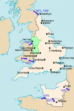 Більшого успіху Вільгельм досягнув у справі забезпечення безпеки Англії з боку валлійських королівств. Початок було покладено призначенням графом Герефорда у 1066 році Вільяма Фіц-Осберна, який збудував низку замків вздовж південної частини кордону з Уельсом й анексував Гвент. У 1071 році було створено Честерську марку на чолі з Гуго д'Авраншем, якому вдалось відсунути англійський кордон до Конві та встановити контроль над Гвінетом. Третя прикордонна марка була створена 1075 року у верхній течії Северна й Ді з центром у Шрусбері. Її граф Роджер Монтгомері розширив територію Англії за рахунок Повіса та звів замок Монтгомері, що домінує над центральним Уельсом[25]. Останньою військовою справою Вільгельма в Англії була його експедиція до південного Уельсу в 1081 році, коли англо-нормандські війська практично без опору дійшли до Сент-Дейвідса.