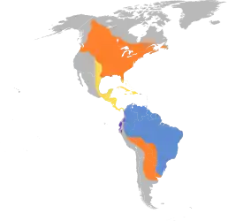 ![]() Поширення віреона червоноокого Гніздування Шляхи міграції Осіле проживання Зимування | ||||||||||||||||