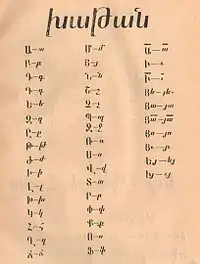 Вірменська абетка (вірм. Հայոց այբուբեն) — звукове письмо, що застосовується для запису вірменської мови. Письмо створене Месропом Маштоцом у 405-406 роках за зразком грецького алфавіту й деяких давніх вірменських систем письма[1]. Доповнене в XII столітті двома буквами (Օ та Ֆ), письмо і сьогодні використовують вірмени. Внаслідок орфографічної реформи 1920-х років було додано нову букву և (великі букви: ԵՎ), яка перед тим була лігатурою ե+ւ. Також з абетки забрали букву Ւ ւ, і створено нову букву ՈՒ ու (яка перед тим була диграфом; буква Ւ ւ стала частиною цієї новоствореної букви).