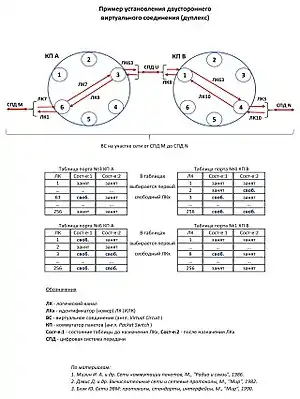 На малюнку, складеному за матеріалами [5] [6] [7], показаний приклад встановлення комутованого двостороннього (дуплексного) ВЗ на ділянці мережі з комутацією пакетів. На кожну фізичну ланку цифровий системи передачі в комутаторах пакетів (КП) умовно виділено до 256 ідентифікаторів логічного каналу (ІЛК) на передачу і до 256 ІЛК на прийом, унікальних тільки в межах даної ланки, що дозволяє встановлювати максимум 256 дуплексних ВЗ. Таблиці показані тільки в частині логічної комутації, для них прийнято, що при встановленні ВЗ займається перший вільний зверху ІЛК. Наприклад, в таблиці порту № 3 КП А зайняті перші 62 ІЛК і так далі для інших таблиць. Після встановлення з'єднання таблиця переходить у 2-ий стан, при цьому якісь ІЛК можуть звільнитися, як, наприклад, ЛК2 в таблиці порту № 4 КП В. У реальних системах принцип заняття вільних ІЛК може відрізнятися.