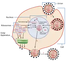 Реплікація вірусної РНК відбувається в клітинному ядрі з допомогою вірусних полімераз PA, PB1, PB2, синтез вірусних білків здійснюється в цитоплазмі, процесинг білків M1, HA і NA відбувається в ендоплазматичному ретикулумі та апараті Гольджі. Синтезовані білки M1, HA і NA направляються до мембрани[24].