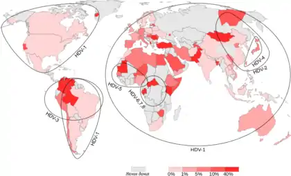 Спершу було описано 3 генотипи цього вірусу (I—III). Генотип I було виділено в Європі, Північній Америці, Африці та деяких реґіонах Азії. Генотип II спостерігають у Японії, на Тайвані та в Якутії. Генотип III виявляють лише в Південній Америці (Перу, Колумбія та Венесуела). Зараз відомо, що існує щонайменше 8 генотипів вірусу гепатиту дельта (HDV-1 — HDV-8). Усі вони, за винятком HDV-1, прив'язані до строго визначених географічних реґіонів. HDV-2 (раніше відомий як HDV-IIa) знайдений у Японії, на Тайвані та в Якутії; HDV-4 (HDV-IIb) — в Японії та на Тайвані; HDV-3 — в районі Амазонки; HDV-5, HDV-6, HDV-7 і HDV-8 — в Африці.