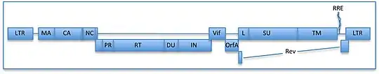 Геном вірусу ВІК диплоїдний. Він складається з двох ідентичних одноланцюгів РНК, у кожному з них близько 9400 нуклеотидів, що існують в орієнтації плюс-ланцюга ((+) РНК). Він має типову геномну структуру ретровірусів і включає гени LTR, vif, pol, gag, orfA, env, та rev.[35] [36] [37] Поліпротеїн gag розщеплюється на матричні (MA), капсидні (CA) і нуклеокапсидні (NC) білки. Розщеплення між CA і NC вивільняє пептид з дев’ятьма амінокислотами, тоді як розщеплення на C-кінці NC вивільняє фрагмент 2 кДа (p2). Поліпротеїн pol транслюється за допомогою рибосомного зсуву рамки, характерної для ВІЛ. Розщеплення pol вірусною протеазою вивільняє саму протеазу (PR), зворотну транскриптазу (RT), дезоксиуридинтрифосфатазу (dUTPase або DU) та інтегразу (IN). Поліпротеїн env складається з лідерного пептиду (L), поверхневого (SU) і трансмембранного (TM) глікопротеїнів. Як і інші лентивіруси, геном ВІК кодує додаткові короткі відкриті рамки зчитування (ORFs), що кодують білки vif і rev. Додатковий короткий ORF під назвою orfA (також відомий як orf2) переважає ген env. Функція orfA у реплікації вірусу неясна, однак продукт, закодований orfA, може мати багато властивостей додаткових генних продуктів ВІЛ-1, таких як Vpr, Vpu або Nef.